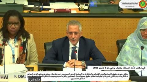 استعرض معالي مفوض حقوق الإنسان والعمل الإنساني والعلاقات مع المجتمع المدني، السيد سيد أحمد ولد بنان، بحضور الوفد المرافق له، التقرير الدوري الثاني لموريتانيا أمام لجنة حماية حقوق جميع العمال المهاجرين وأفراد أسرهم بجنيف، وذلك في إطار الاتفاقية الدولية لحماية حقوق العمال المهاجرين.