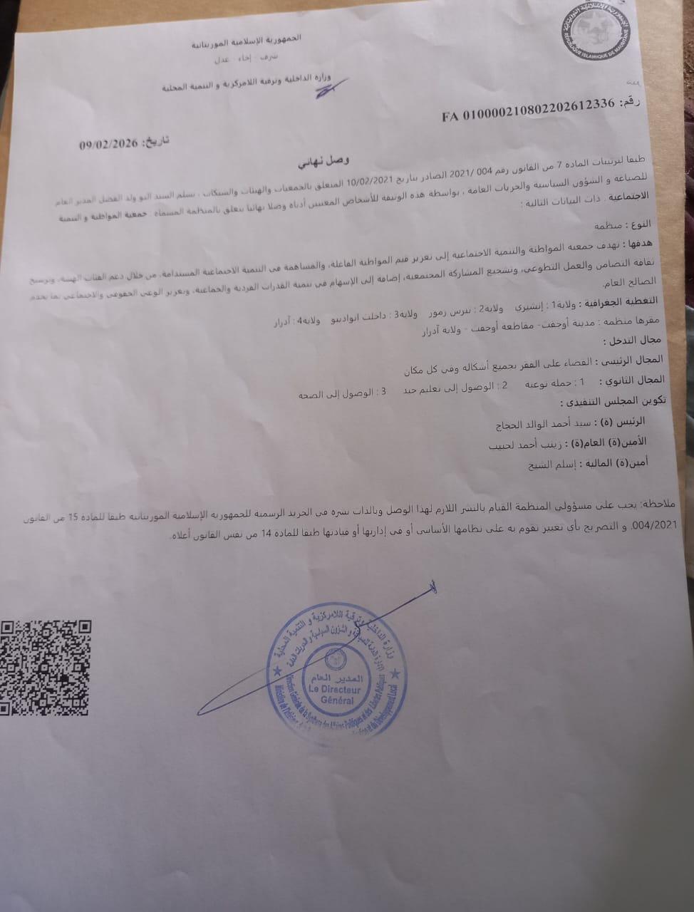 شهدت مقاطعة أوجفت الإعلان عن تأسيس جمعية المواطنة والتنمية الاجتماعية، برئاسة المناضل الدح ولد الحجاج، في خطوة جديدة تعزز حضور المجتمع المدني وتدعم الجهود التنموية على مستوى بلدية معدن العرفان والقرى التابعة لها، وكذا المقاطعة والولاية عموماً.