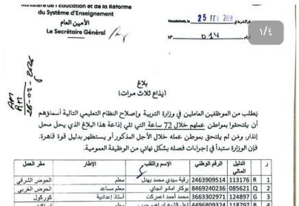 وبينت الوزارة في بلاغ لها أنه في حال عدم الامتثال خلال الأجل المحدد، ستُفعل إجراءات الفصل النهائي من الوظيفة العمومية.