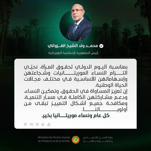 "بمناسبة اليوم الدولي لحقوق المرأة، نحيّي التزام النساء الموريتانيات وشجاعتهن وإسهاماتهن الأساسية في مختلف مجالات الحياة الوطنية.